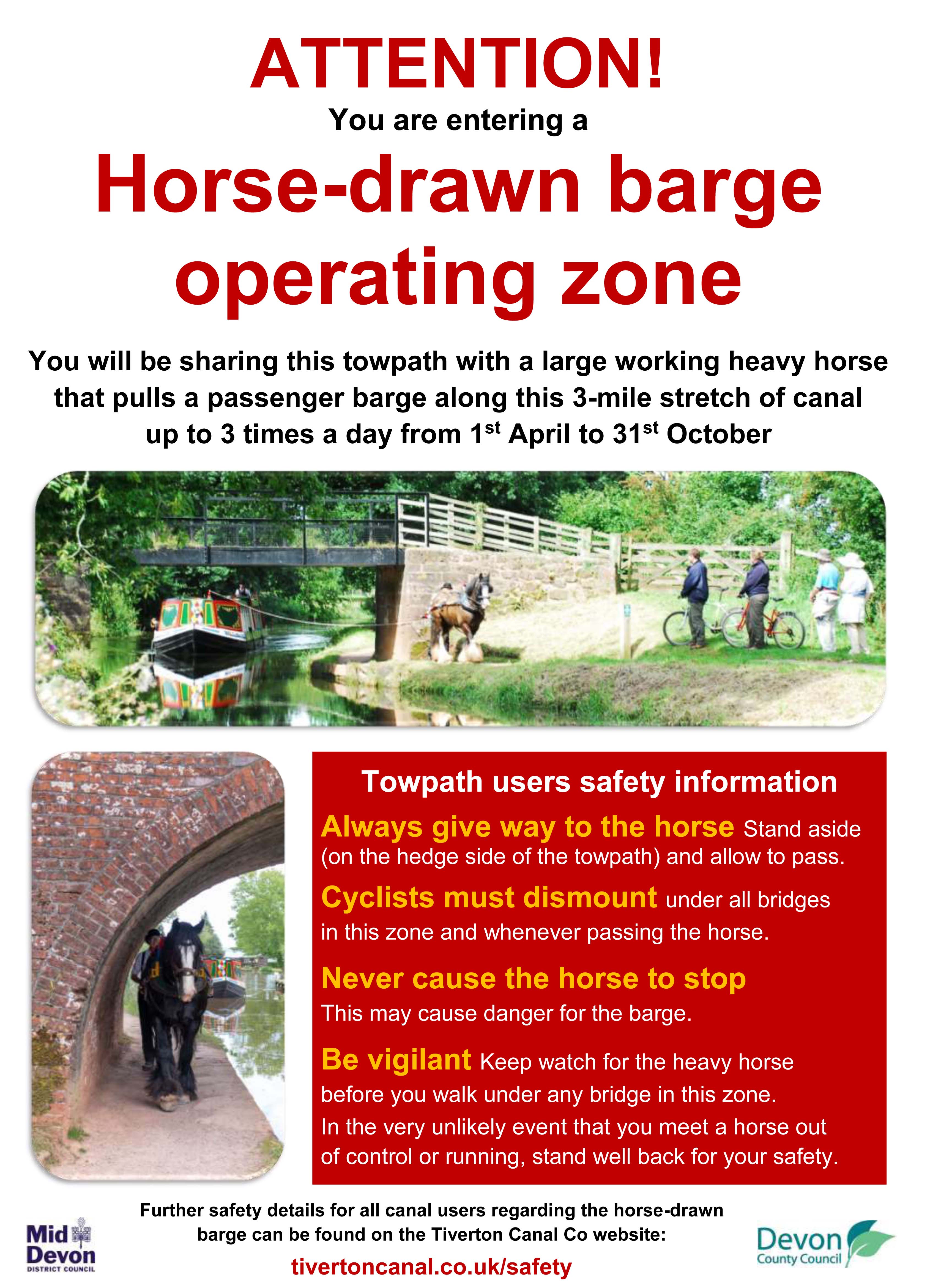 Further Safety Details for All Canal users, regarding the Horse-Drawn Barge will appear here on our website.